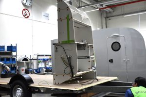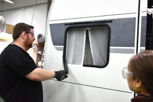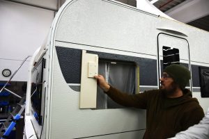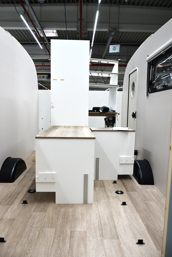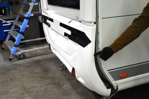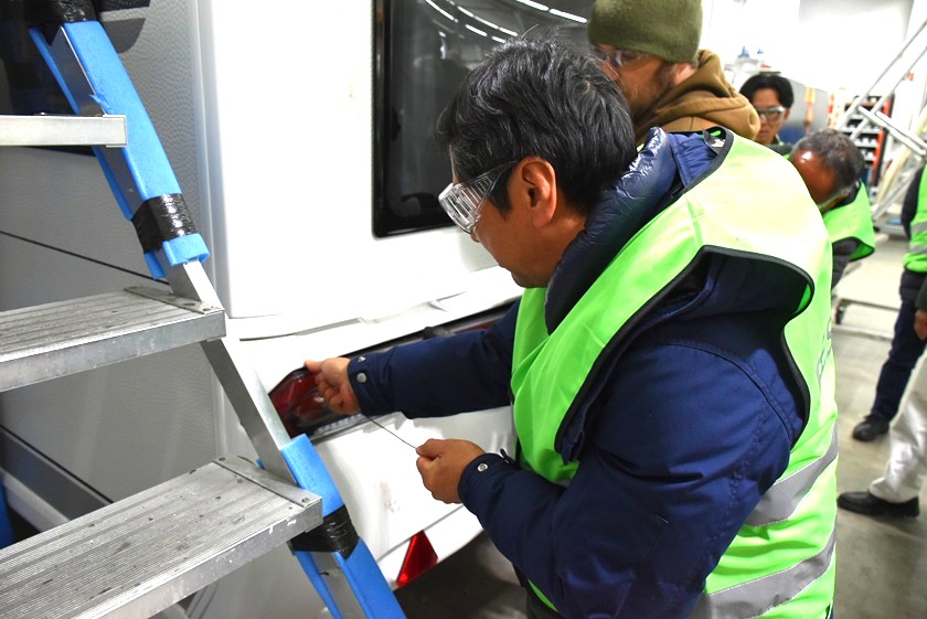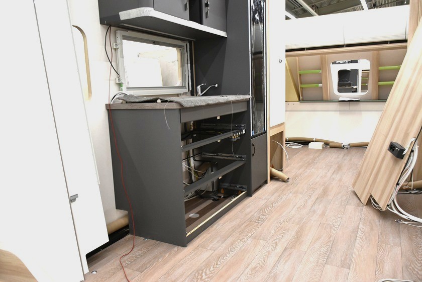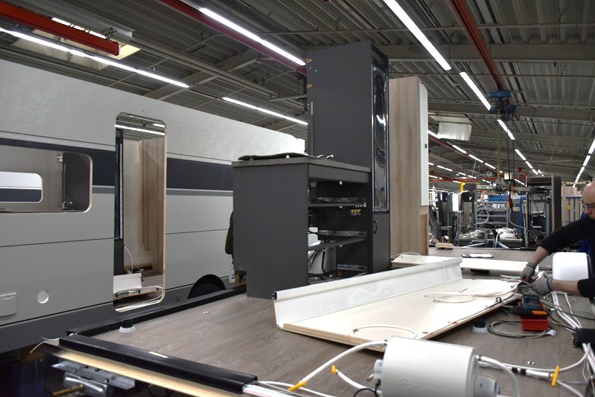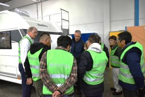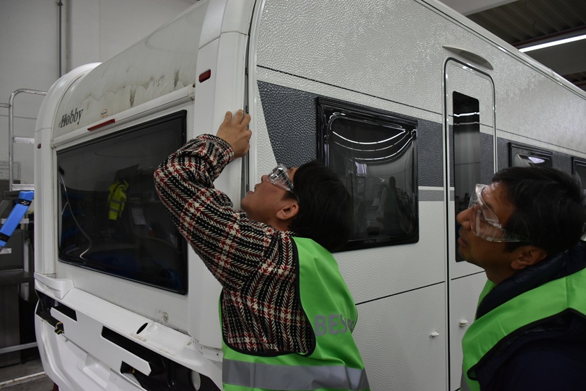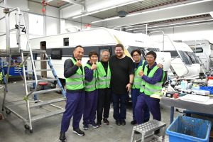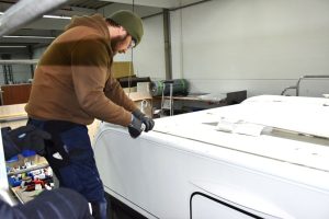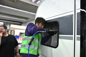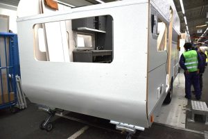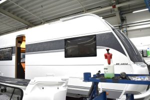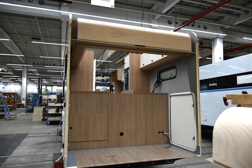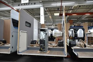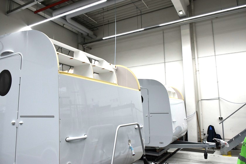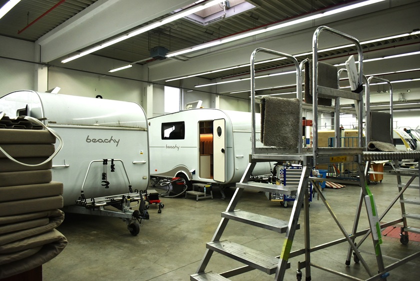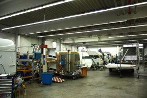 この作業スペースは、手前側にBeachyが2台、奥にはHobby Caravanが数台 Hobby MotorHomes が1台大修理のため入荷していました