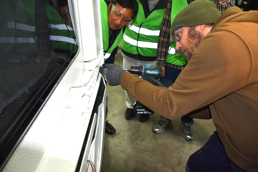 貼り付けられたパネルには必要部品、窓枠、補強、ビスを止めるためのアルミなどが施されて