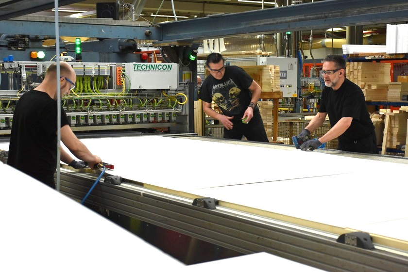 その後自動接着機械で、アルミパネルが貼り付けられます