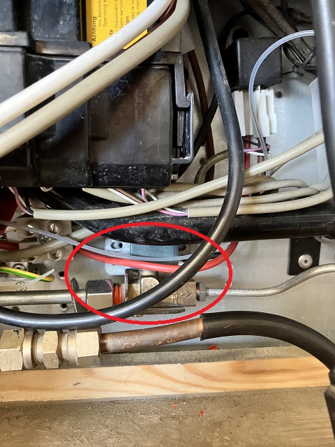 今回のトラブルの原因は、赤丸印のガスを放出するガスバルブの電磁弁の作動不良でした。