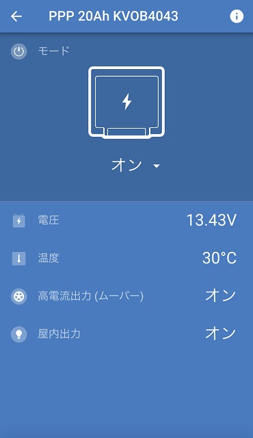 現在のリチウムバッテリーの電圧、温度等が表示されます
