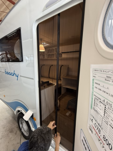 早速展示車のBeachy360に同様の網戸を取り付けてみました。