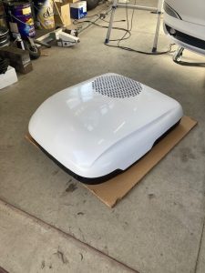 こちらのルーフエアコンの重量は約40㎏あります。落とさないよう4人で搭載しました。